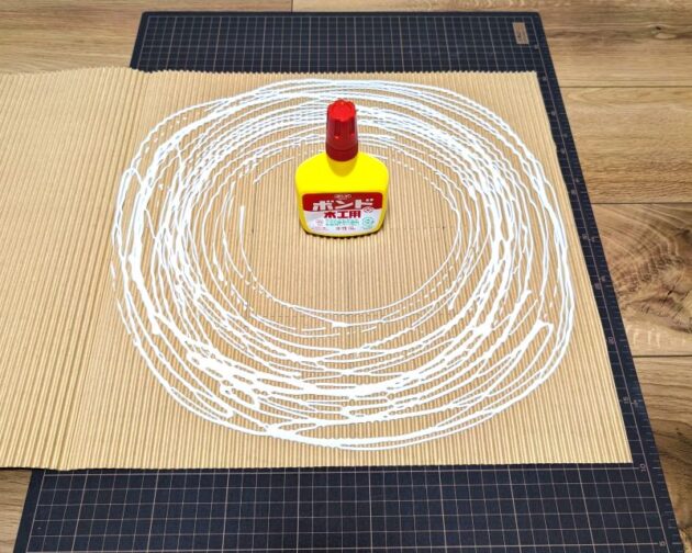 ちなみに上に載せたボンドの写真、これは塗り過ぎでダメな例です。ダンボールがシワシワになってしまいます。また、二重にした巻きダンはあとで真ん中をくりぬきます。なので中心付近にボンドは塗りません。