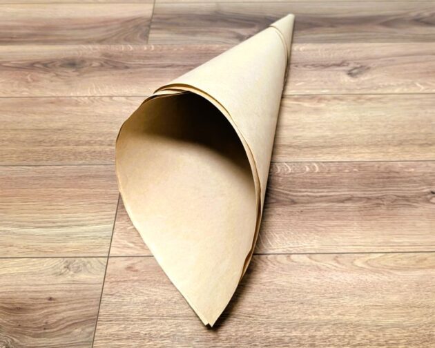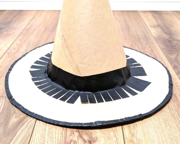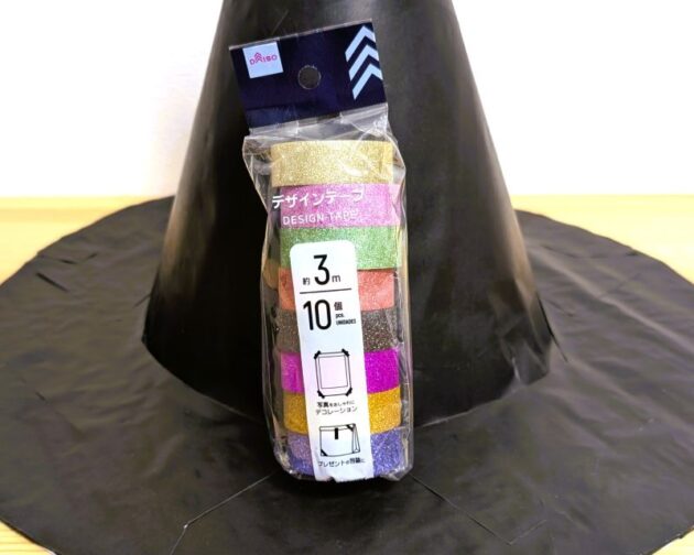斜めに巻くとコーンの形になるので適当なところでテープで留めます。あとでツバに通したときに引っかかるように大きめの円を作ります。