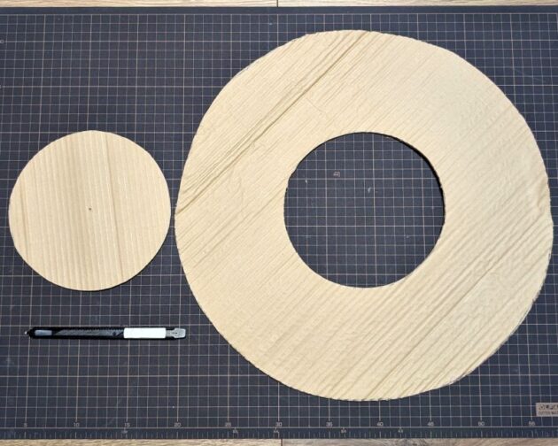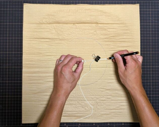 ヒモとクリップと釘を使って円を描きます。ツバの内側と外側の両方描きます。もちろんコンパスでもOKです。