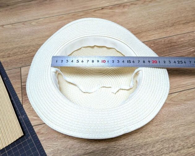 ツバの大きさ(直径)は子どもの帽子を参考に、だいたい頭の直径の2倍くらいに決めました。大き過ぎたら切ればいいので大きめに見積もっておいた方が良いかもしれません。