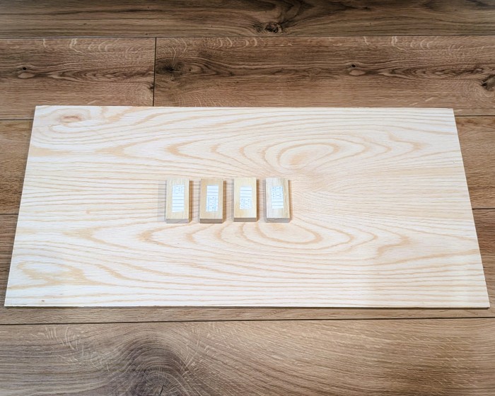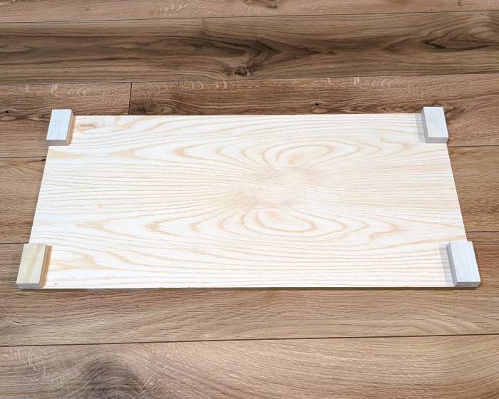 ハムスターハウスの底面に残りの4つの長方形の木材を貼ります。L字の足に合わせて貼りました。ひとつだけ思いっきりズレてますが、これも子どもと楽しむDIYの醍醐味です。