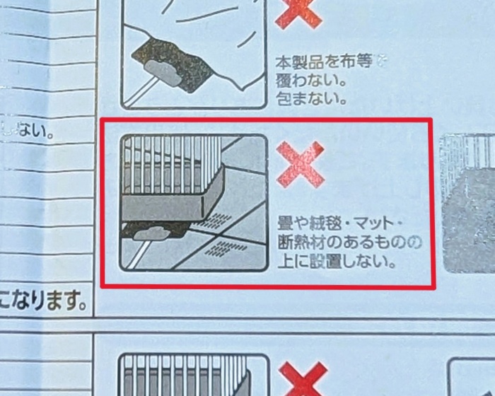 箱には書いてなかったのですが、取説を見てみると「畳で使ったらダメ」の記載。